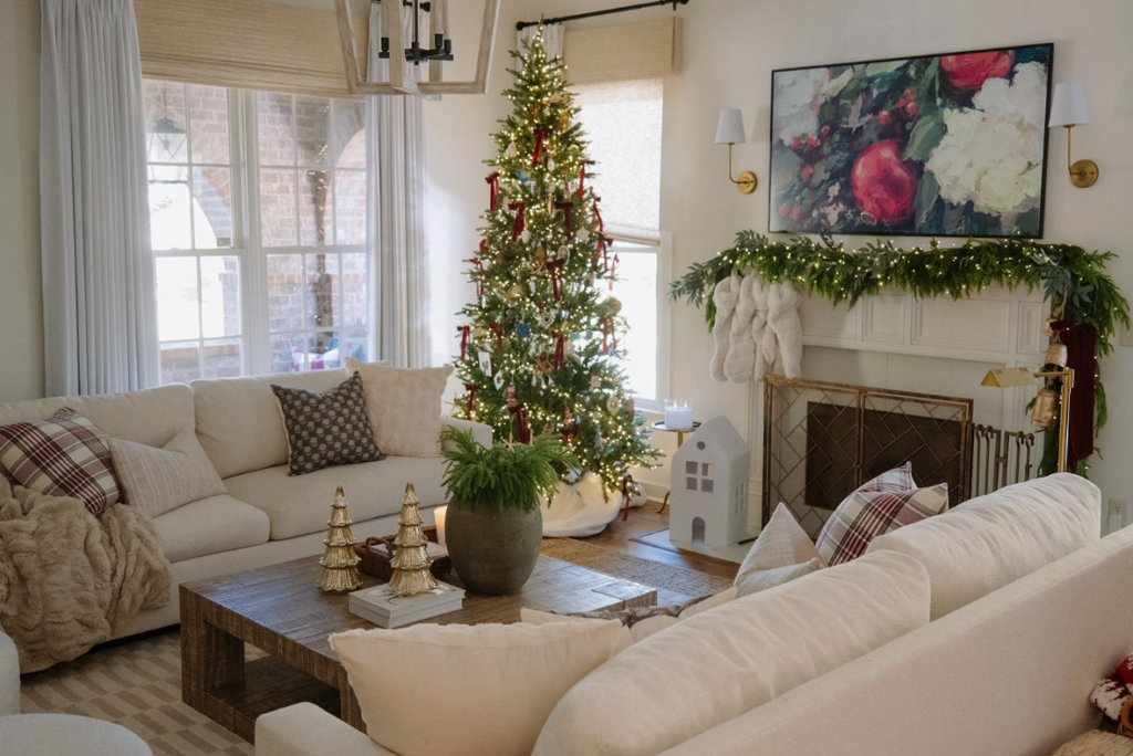 The living room is often considered the centerpiece of holiday decor, and in this tour it lives up to that expectation. A large Christmas tree takes central focus, adorned with ornaments and lights that reflect both tradition and personal style. The tree anchors the space and serves as a backdrop for other carefully placed elements.