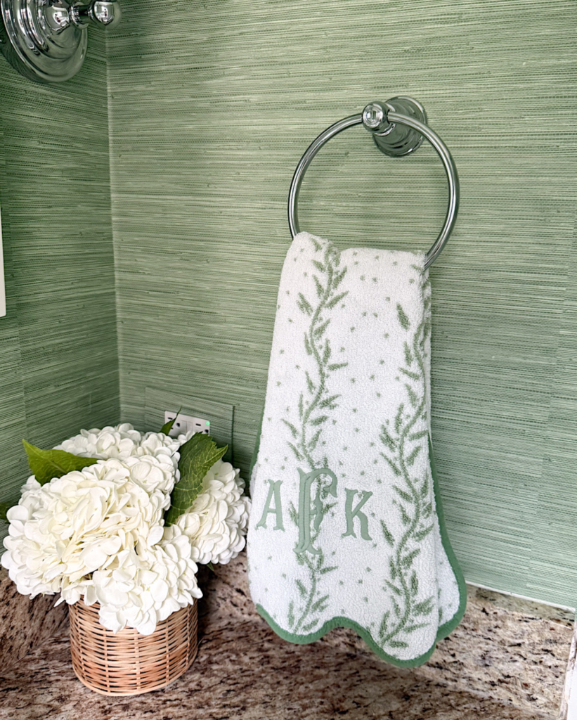The powder bathroom, a high‑traffic space on the first floor, also received a thoughtful upgrade. Here, Weezie’s scallop‑edged floral towels in a vibrant green were the perfect choice. Their delicate pattern and rich hue harmonize beautifully with the room’s wallpaper, adding texture and visual interest. This subtle yet impactful change offers a joyful surprise each time the space is used—a small update that makes the everyday feel a bit more elevated.